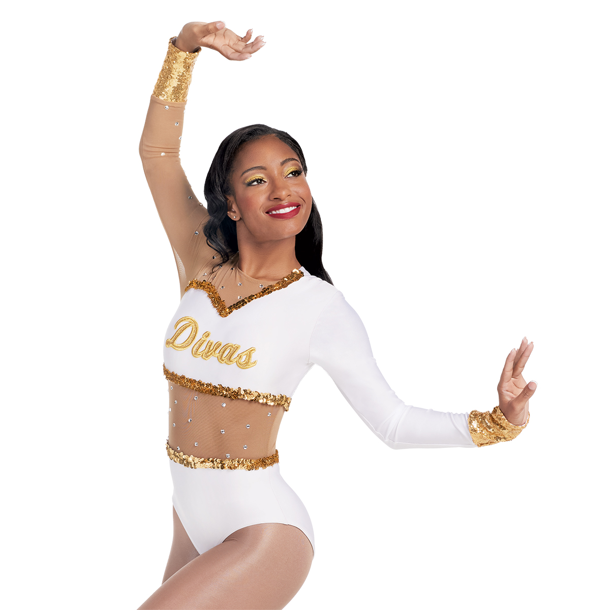 Make a statement with this long sleeve bodysuit leotard, designed for maximum impact and effortless movement. Featuring sequin trim and rhinestones, this leotard delivers standout sparkle under the lights. The mesh-covered midriff opening adds a bold, modern touch, while attached sequin cuffs enhance every motion. A zippered back entry ensures a secure, comfortable fit, making it ideal for pom squad, dance, and majorette performances. Optional group or mascot name for a little more lets you show your team spirit. Designed for style, flexibility, and confidence—order now to shine at your next event!
