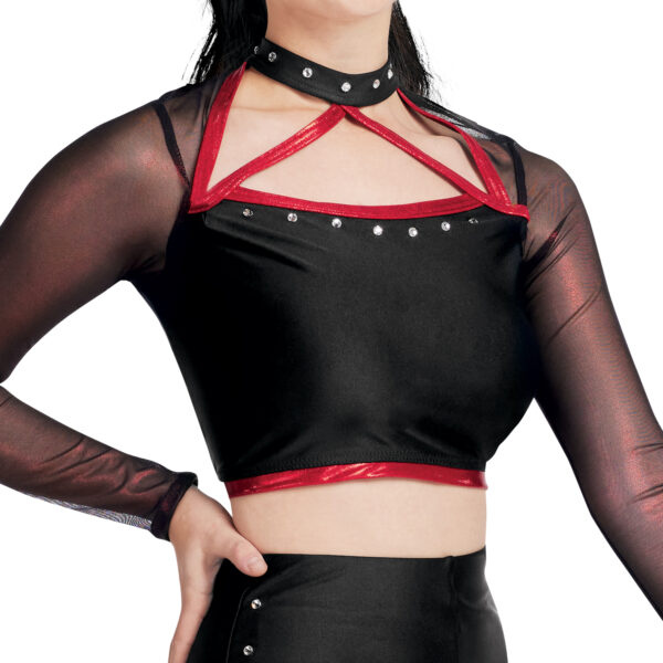 Stand out with every step in this bold crop top and rhinestone-accented custom uniform designed for high-energy routines. The long sleeve crop top features an open bodice with striking strap accents, delivering a modern, standout look. A mock neck collar adds sleek sophistication, while dazzling rhinestones bring eye-catching shine under the lights. The zippered back entry ensures a secure, comfortable fit, so you stay confident in every motion. Coordinating shorts complete the look with matching rhinestone embellishments. Designed for pom squads, dance teams, and majorette performances, this uniform combines flexibility, comfort, and bold style.